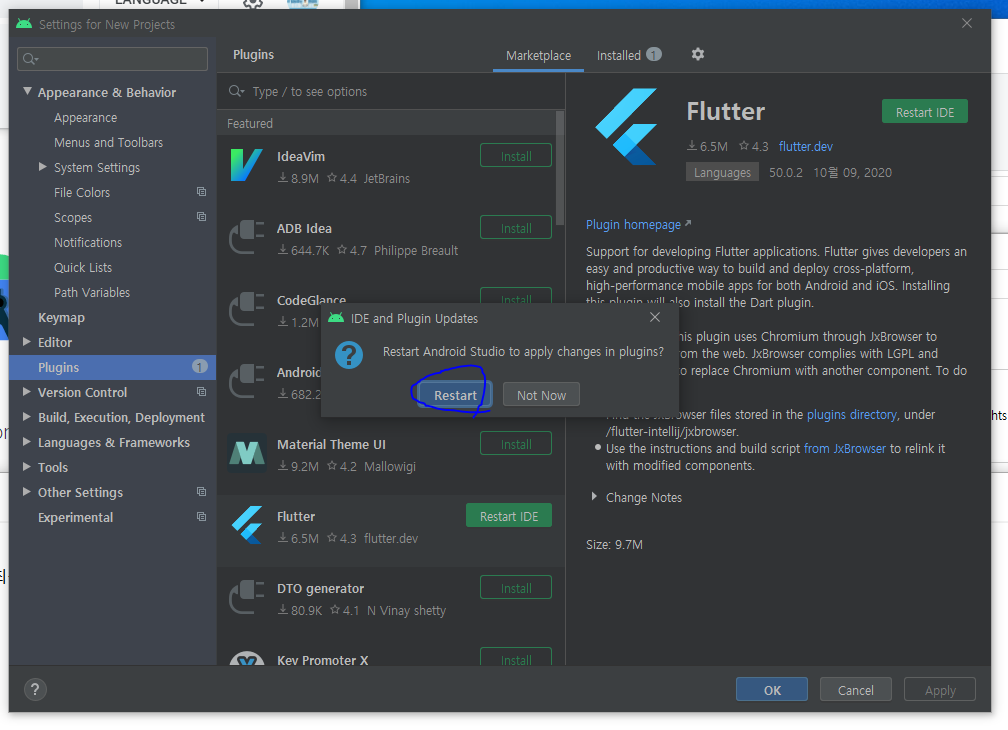 Plugins 탭을 눌러서 보면 Flutter가 있을거다. Install을 눌러주자.