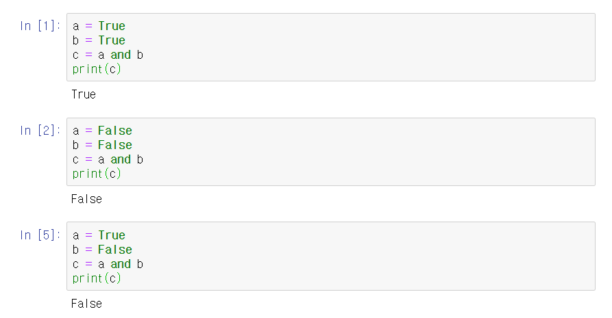 참, 거짓을 판별할 때 쓰는 boolean 타입은 True 나 False 둘 중에 하나를 가진다. 이 boolean 타입에 사용할 수 있는 연산자는 and, or, not 이 있다. 고등학교 때 수학 시간에 졸지 않았다면 아래의 예제를 이해하는데 무리가 없을 것이다. 수학시간에 충분히 잘 잔 나도 이해하니깐 말이다.
