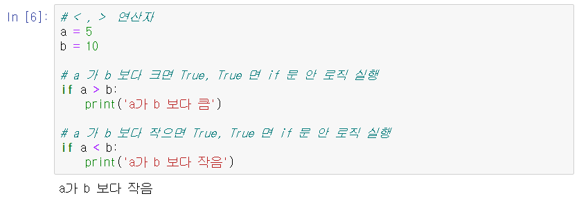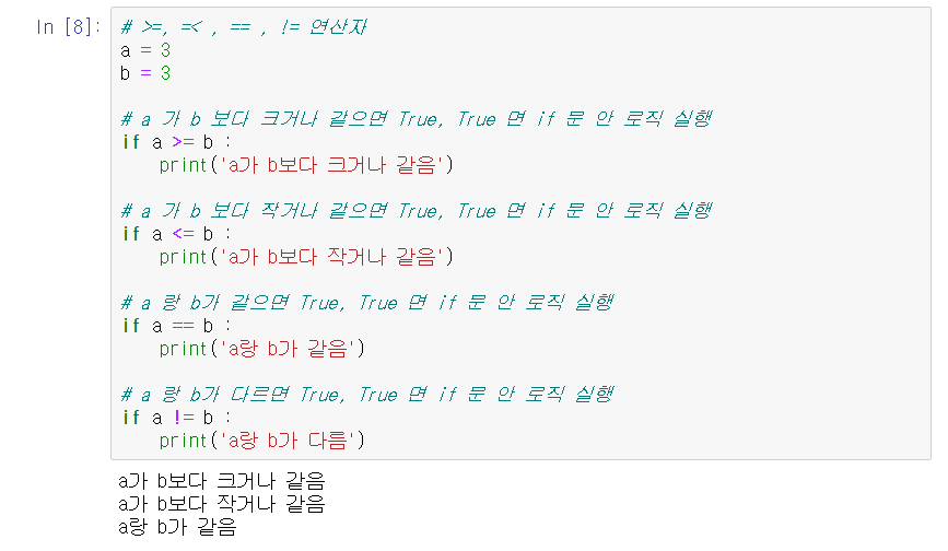 == 이나 != 같은 경우에는 java 같은 언어에서는 저걸로 문자열을 비교하면 에러가 났다. ㅎㅎ 하지만 파이썬은 == 이나 != 으로 비교하는게 가능하다.