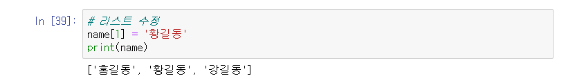 리스트 수정은 리스트변수[index] = 변경하고자하는데이터 의 형태로 수정이 가능하다.