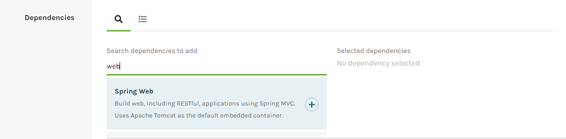 여기는 우리가 의존성을 주입할 녀석들을 입력해주면된다. 간단하게 Spring MVC를 위한 의존성만 주입해보자.