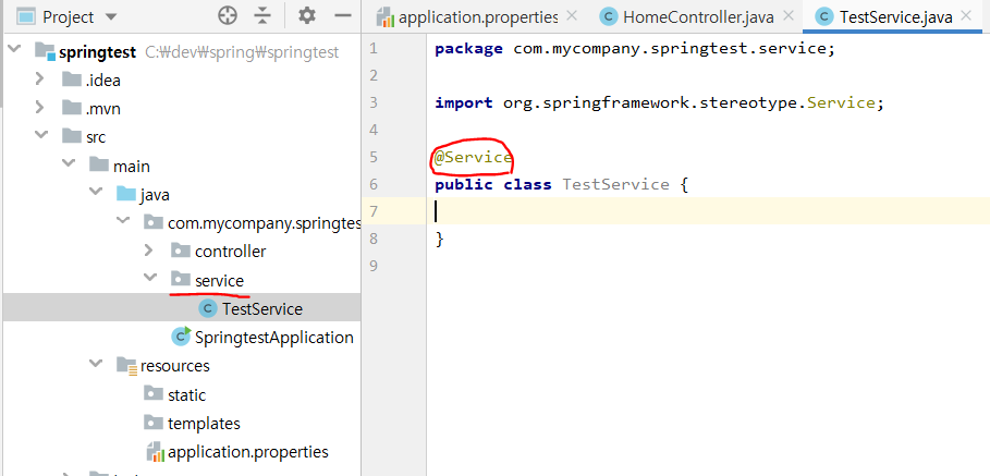 아래처럼 서비스 패키지와 클래스를 하나 만들어주자. 어노테이션으로는 @Service를 잡아주면 된다.