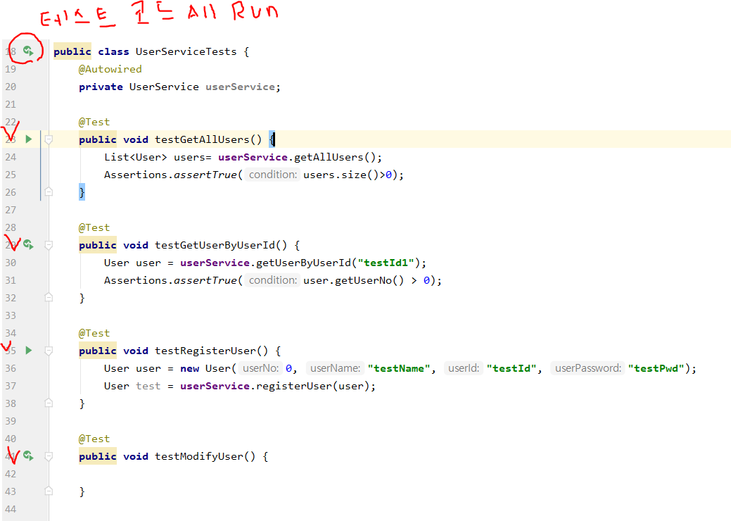 클래스 옆의 실행 버튼은 테스트 코드를 전체 실행시키는 것이고, 아래 메서드 옆의 실행 버튼은 각각의 메서드를 하나씩 실행시키는 것이다.
