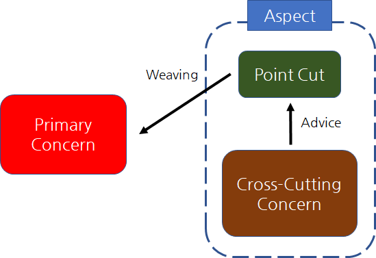 그리고 Cross- Cutting Concern 은 로깅, 보안 등의 기능을하는 부가 기능이다. 이건 Runtime 때 Core Concern과는 별도로 만들어진다. 그리고 Point Cut 이라는 문법이 있는데, 이건 Cross-Cutting Concern을 어디에 적용시키느냐의 위치정보가 들어있는 문법이다. Point Cut 과 Cross-Cutting Concern을 합쳐서 Aspect라고 한다. Spring에선 Adviser라고 부르기도한다. 그리고 실제 런타임 때 이를 핵심기능에 끼워넣는 걸 Weaving이라고 한다.