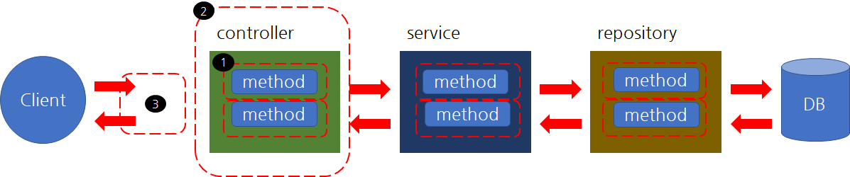 스프링 시스템은 전에도 설명한 것처럼 Layered 한 시스템이다. 고로 각 통신은 인접한 영역끼리 일어난다.