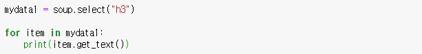 일단 h3이라는 태그로 가져오는 예제를 한번 해봤다. 이렇게하면 모든 h3 태그 안의 데이터를 쭉 가져올 수 있다.