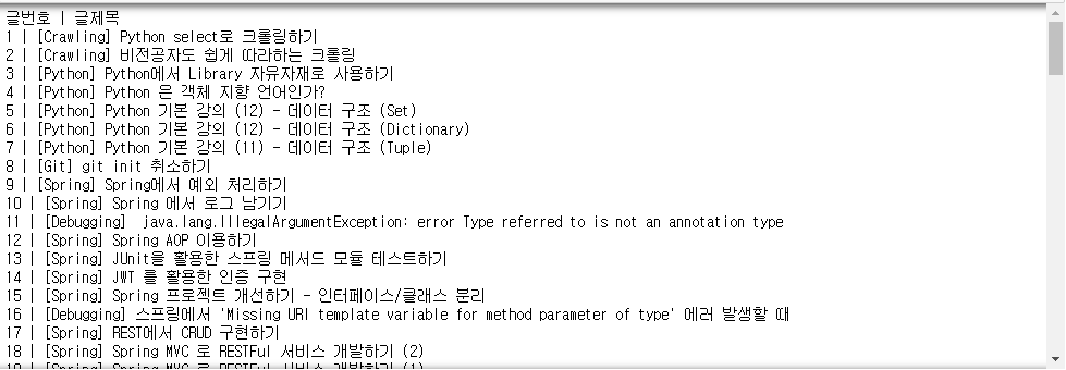 일단 내 블로그 메인 페이지를 들어가보면 위의 화면과 같이 리스트로 정렬이 되어 있다. 나는 저기 저 글 제목들을 쭉 긁어서 액셀 파일로 만들어 볼거다.