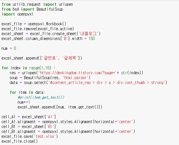 이전에 공부했던 부분과 좀 다른게 ...! requests 라이브러리 대신 urllib 라이브러리를 사용했다는 것과 액셀 이용을 위해 openpyxl 라이브러리를 사용했따는 것이다.