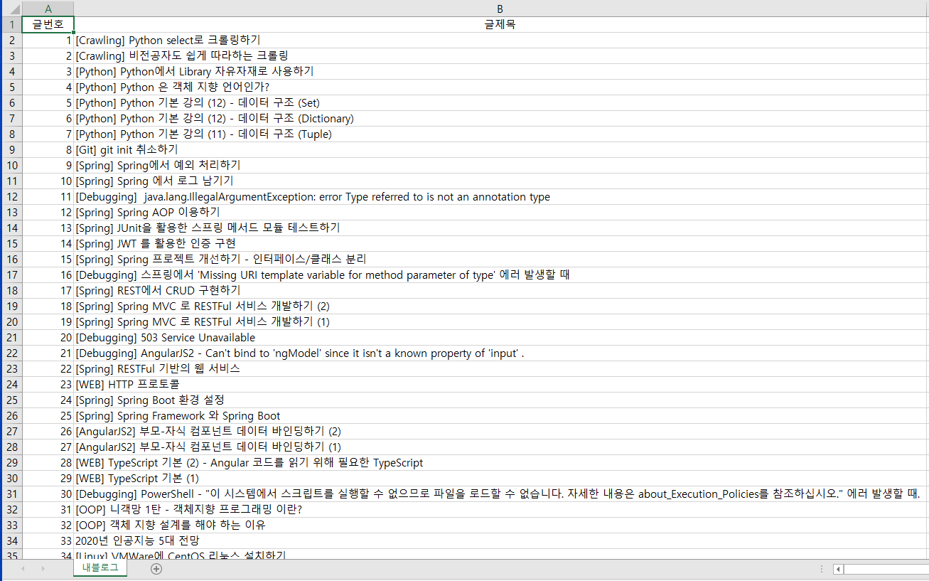 일단 내 블로그 메인 페이지를 들어가보면 위의 화면과 같이 리스트로 정렬이 되어 있다. 나는 저기 저 글 제목들을 쭉 긁어서 액셀 파일로 만들어 볼거다.