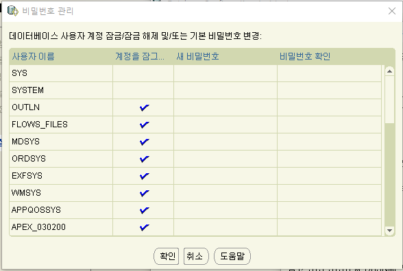 마지막으로 비밀번호 관리로 들어가서 SYS, SYSTEM 계정 말고 다른 계정은 잠겨 있는지 확인해주자.