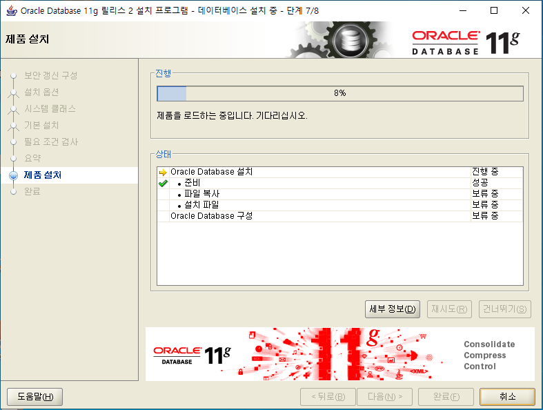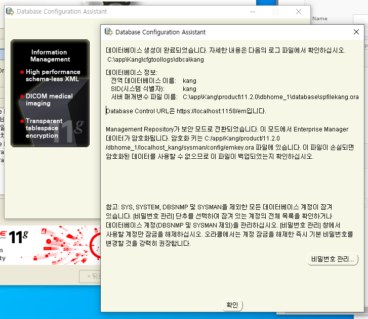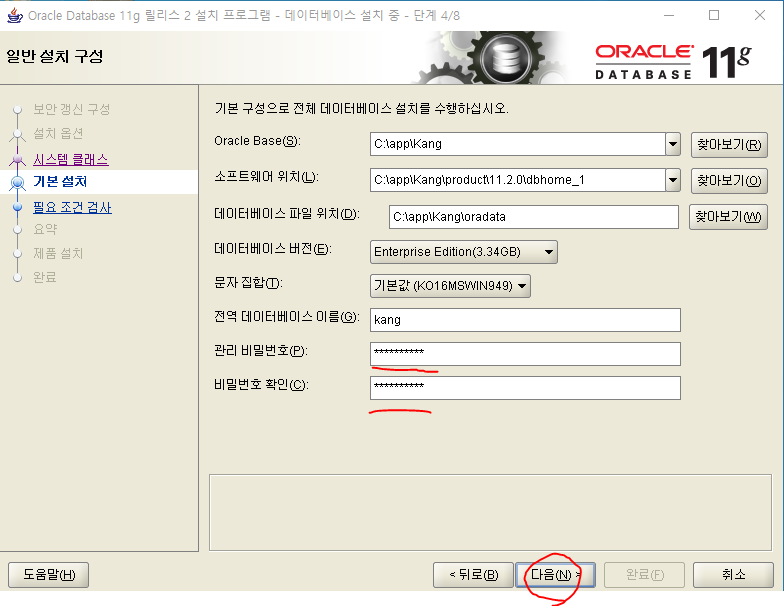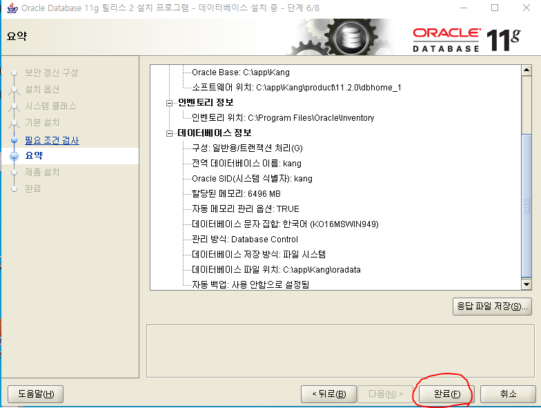 자 그리고 내가 설치할 오라클 데이터베이스 요약정보를 확인한 뒤에, 완료를 눌려주자.
