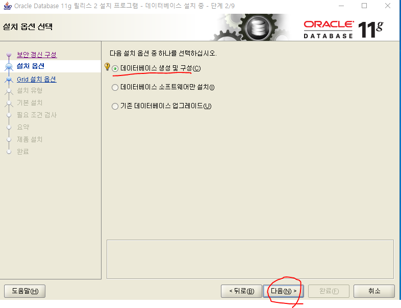 그리고 디폴트로 된 "데이터베이스 생성 및 구성"을 그대로 한 뒤에 다음 !