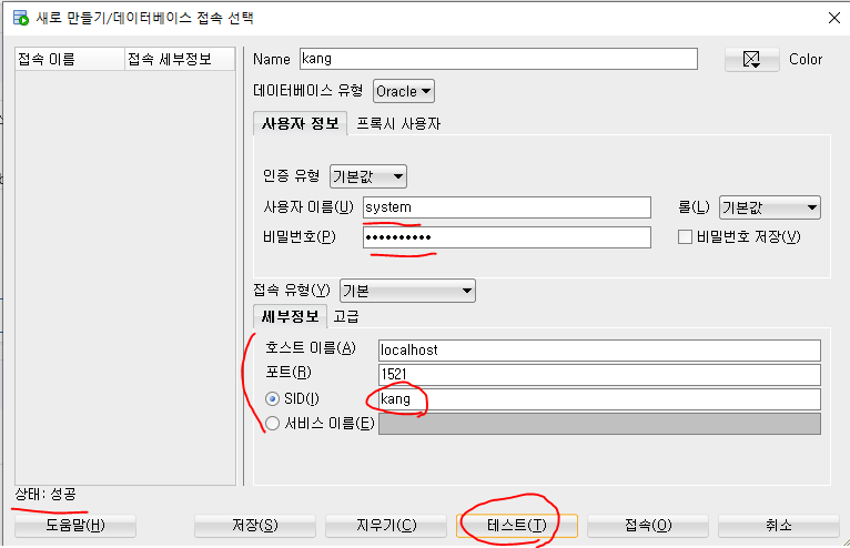 아래의 SID 같은 경우는 디폴트는 "xe" 지만 나는 이전에 전역 데이터베이스를 "kang" 이라고 해줫으니깐 이렇게 바꿔줘야한다 ㅎㅎ . 그러고 테스트를 눌려주면!!