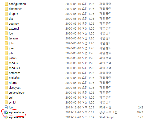 설치하고 나서 압축을 풀어주면 "sqldeveloper" 이라는 놈이 있다. ㅎㅎ 실행시켜주자.