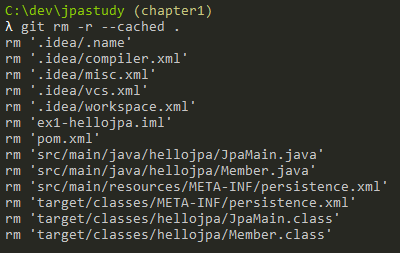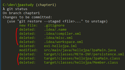 마지막으로 git status 를 통해 내용을 확인해보면 .gitginore 파일에 등록된건 삭제되는걸 확인할 수 있다.