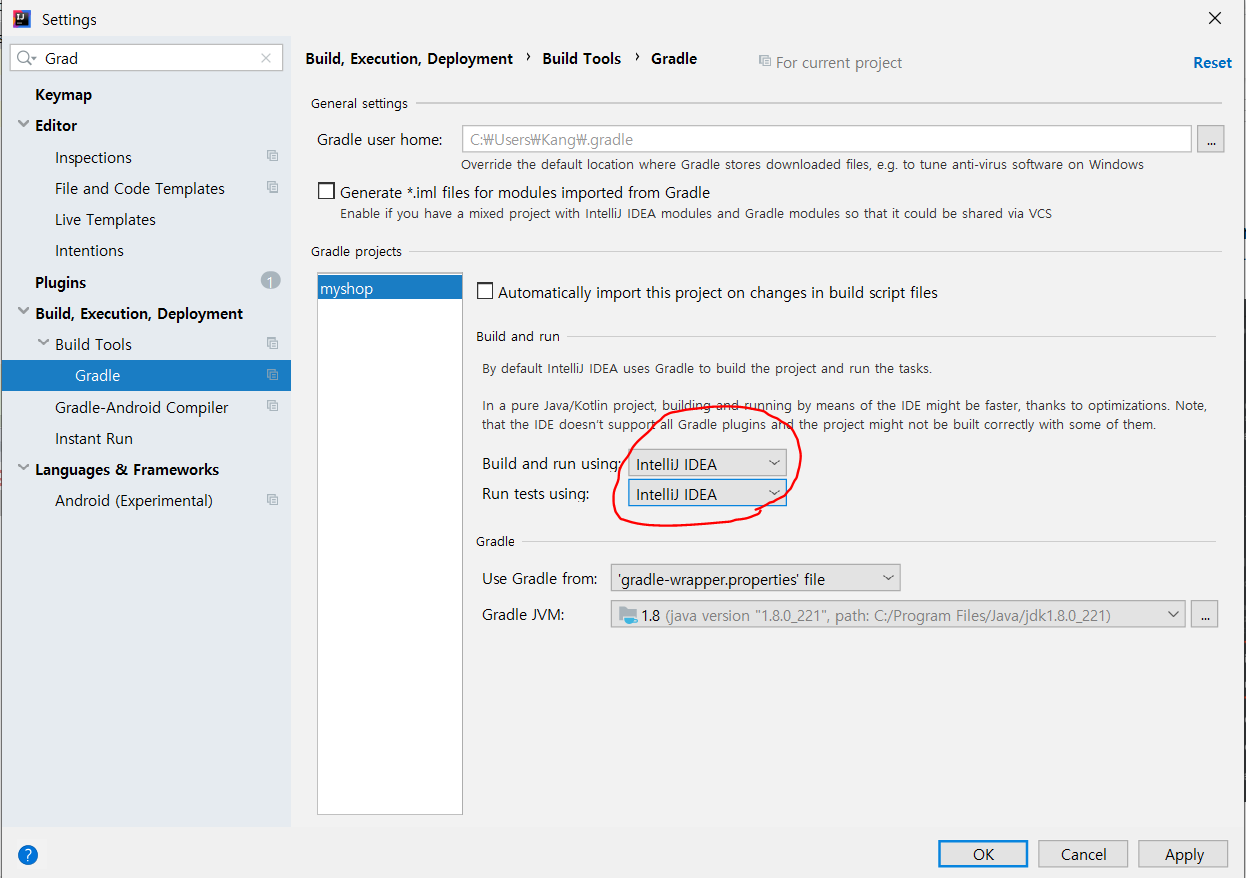 Build and run using: 부분을 Gradle -> Intellij IDEA로 변경해주자. 그리고 Run tests using 역시 아래와 같이 IntellJ IDEA로 변경해주자.
