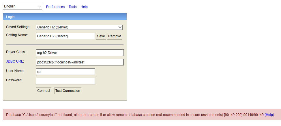 세팅을 Generic H2(Server)로 하고 connect를 누르면 이런 에러메시지를 만날 수 있다.