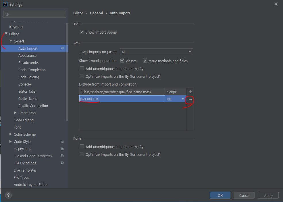 Settings > Editor > General > Auto import 메뉴로 가 보면 .. import 제외 항목에 java.util.List가 있는 것을 확인할 수 있다. 이걸 "-" 를 눌려서 지우고 Apply 해주자.