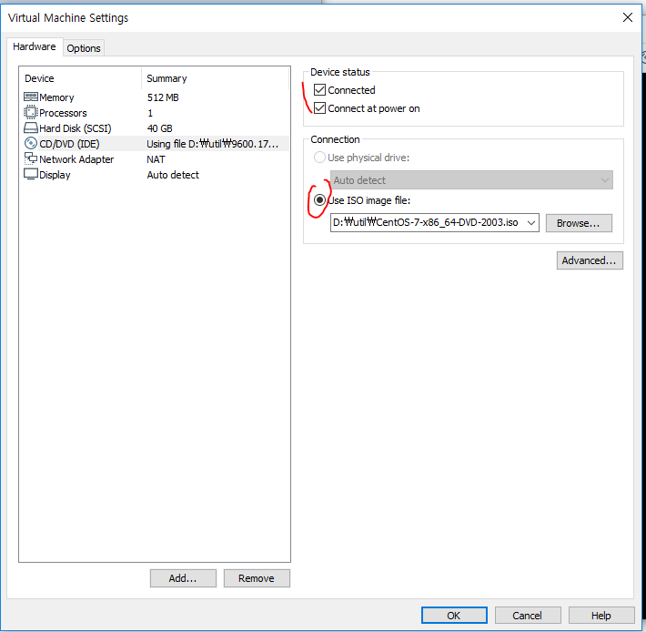 그리고 기존에 있는 iso 파일을 연결하자.
