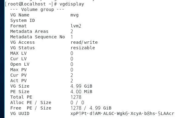 생성된 볼륨그룹은 vgdisplay 명령어로 볼수 있다.