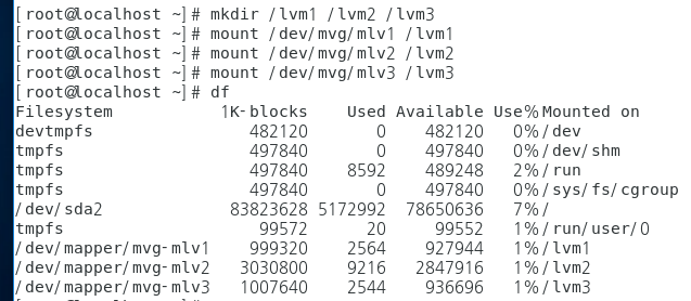 위의 그림은 물리 볼륨인 2GB 짜리 하드디스크와 3GB 짜리 하드디스크를 합쳐서 하나의 볼륨그룹 (5GB) 으로 묶은 뒤, 다시 각각 1GB, 3GB, 1GB 로 분할해서 /lvm1, /lvm2, /lvm3 디렉터리에 마운트를 해서 사용하는 그림이다.