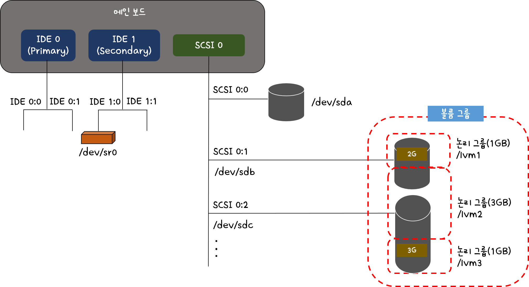LVM 은 여러개의 하드디스크(물리 볼륨)을 하나로 묶어 볼륨그룹으로 만들고, 다시 필요한 용량의 파티션(논리그룹)으로 나눠서 사용하는 것을 의미한다.