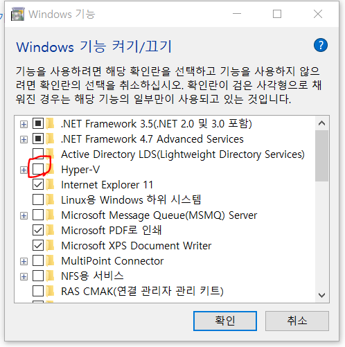 만약 Hyper-V 가 체크 되어있으면 체크해제 해주자.