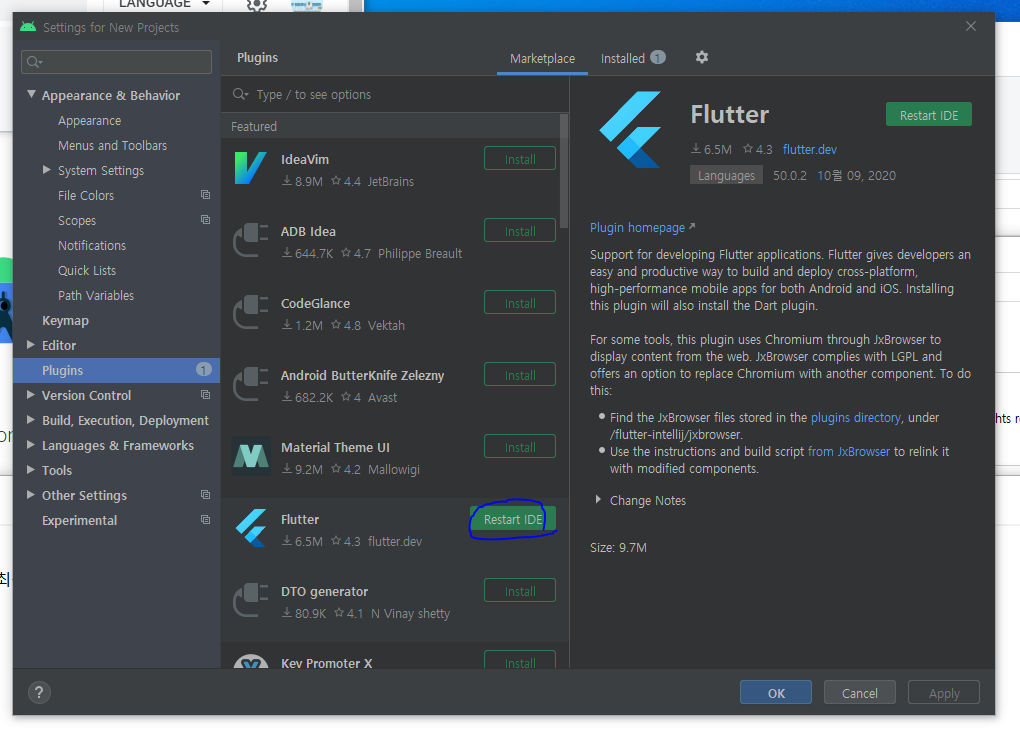 Plugins 탭을 눌러서 보면 Flutter가 있을거다. Install을 눌러주자.