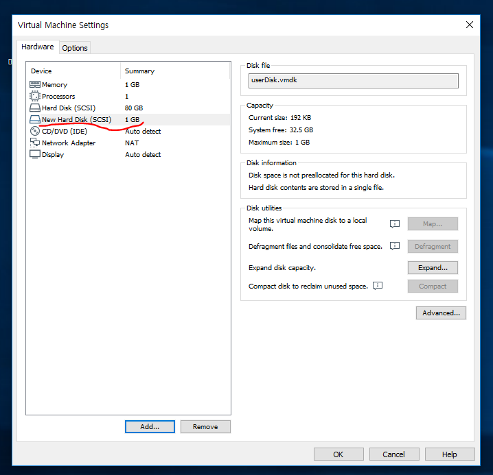 먼저 새로운 디스크를 하나 장착하자. 크기는 1GB 짜리로 SCSI 형태로 장착하면 자동으로 SCSI 0:1이 장착될것이다.