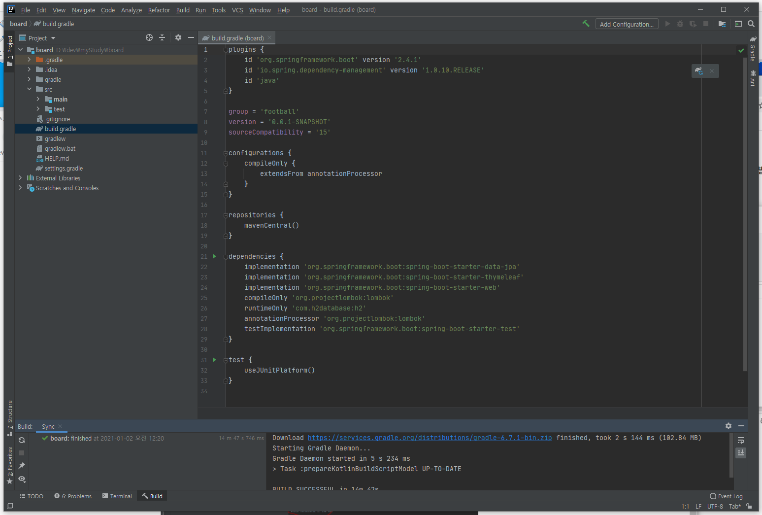 import 된 프로젝트에서 build.gradle을 보면 우리가 아까 추가한 디펜던시 등 여러 정보를 확인할 수 있다.