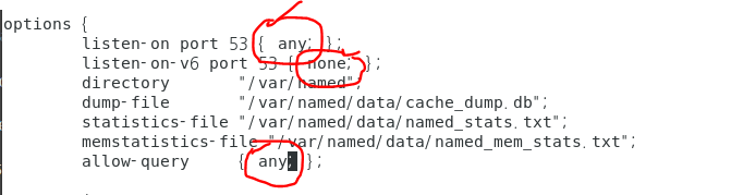 이렇게 위의 세군데를 각각 any, none, any로 고쳐주자. 지금 이 설정은 vmware 가 사용하는 가상머신의 네트워크 주소에 있는 모든 컴퓨터가 네임서버를 사용할수 있게 설정해주는 것이다. 그런뒤에 named 서버를 재기동하고 확인해보자.