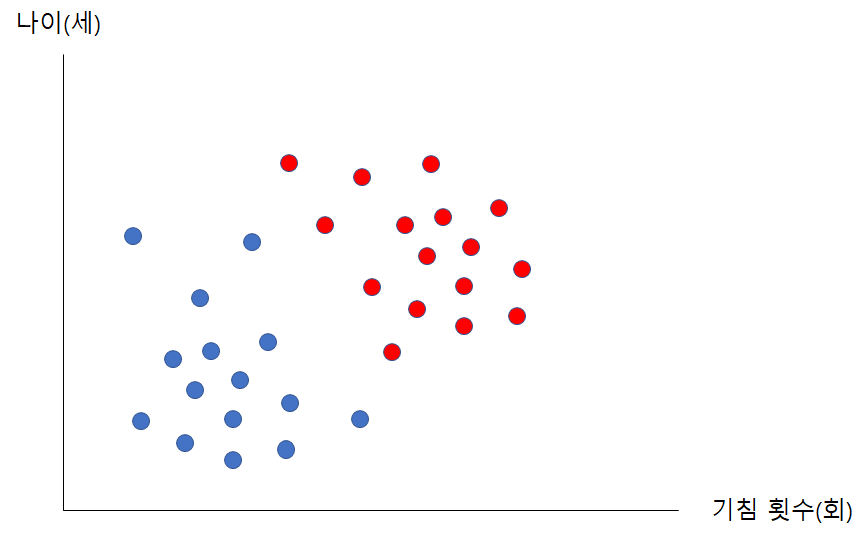 위의 그래프에서 빨간점이 그 병에 걸린사람이고 파란점이 안 걸린사람이라 생각해보자.