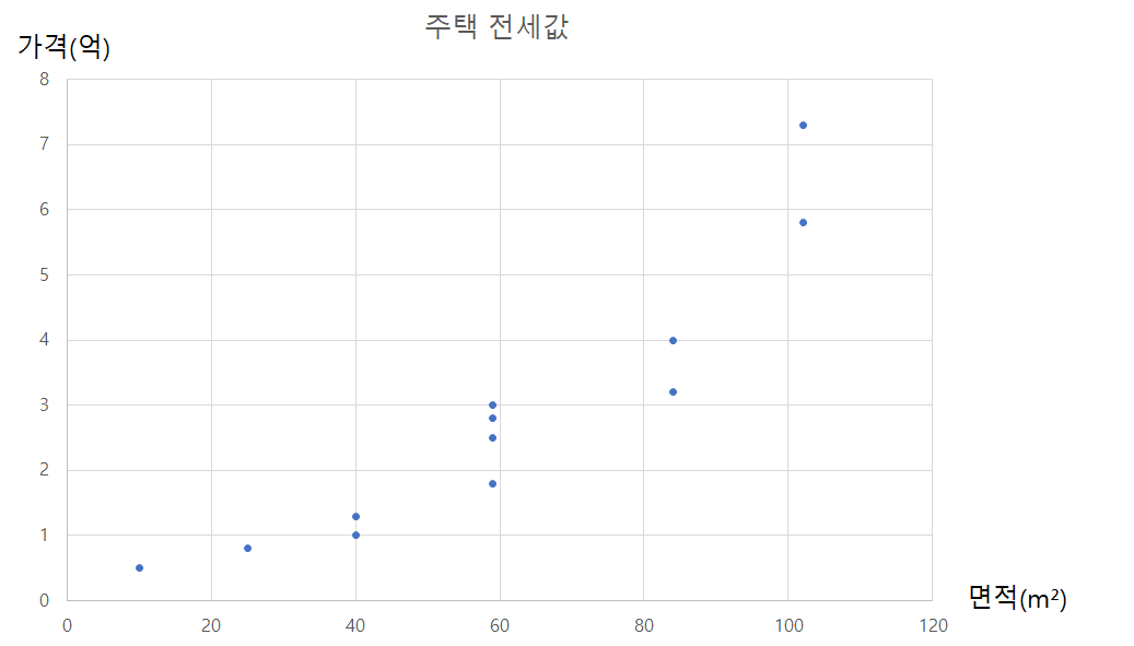 예를들어서 50m²의 집은 1.5억 정도 하고, 100m²의 집은 6억 정도 하는구나 하고 예측이 가능해진다.