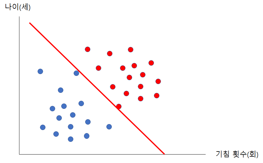 나이와 기침 횟수를 속성으로 하여 분포를 그려보니 위의 그래프가 나왔다라고 했을때, 아 나이와 기침 횟수가 A병에 연관이 있다고 생각이 들 것이다. 여기서 우리가 정확하게 구분하는 선을 하나 그어보자.