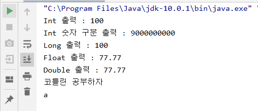 다른 건 다 자바랑 비슷한데, 두번째에 작성한 9_000_000_000 이건 좀 신기하다. 원래 숫자를 기입할때 세자리씩 끊어서 표현하는 걸 Kotlin에서는 지원하고 있다.