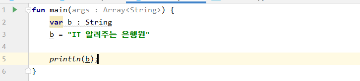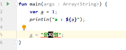 하지만 그렇지는 않다. Kotlin에서는 따로 자료형을 설정해주지 않으면 var에다 최초로 넣어주는 값이 자료형으로 결정된다.