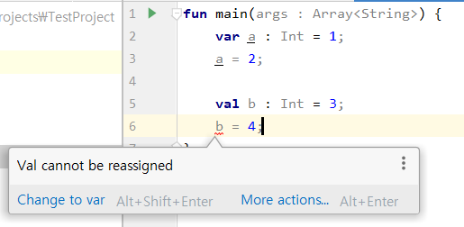 그리고 val 이라는 키워드가 있다. val 은 자바로 따지면 final 변수라고 생각하면 되겠다. 한번 변수를 넣고 쓰면 변경이 불가능한 읽기 전용 변수라고 생각하면 된다.