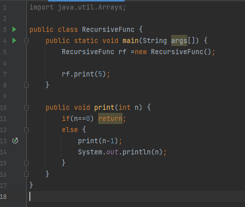 아래의 코드는 1~5 까지 숫자를 차례로 출력하는 것을 for문을 이용하지 않고 재귀를 이용하여 출력한것이다.