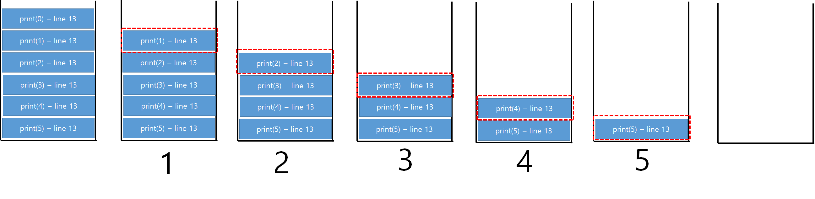 간단하게 말씀드리자면 스택에는 함수가 호출 될때 호출되는 라인 정보까지 같이 쌓이는데 상단의 스택이 처리가 되고 나서 본인의 작업이 처리될때는 그다음라인부터 수행하게된다. 그렇기 때문에 위처럼 1 2 3 4 5 이렇게 출력이 될수 있는 것이다.