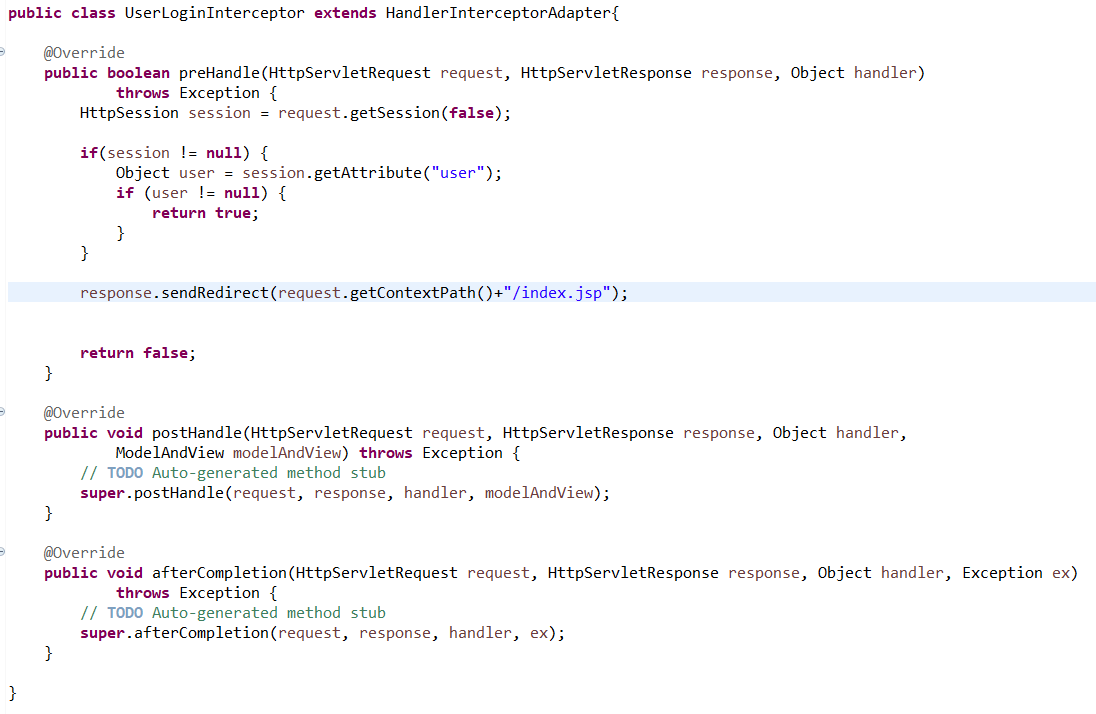 뭐 어렵지 않은 코드이다. 세션에 저장된 Attribute 가 있는지를 검사하고, 없으면 페이지를 redirect 해주는거다. 이 코드를 만들었으면 스플이 설정파일 (servlet-context.xml) 에 interceptor를 추가해준다.