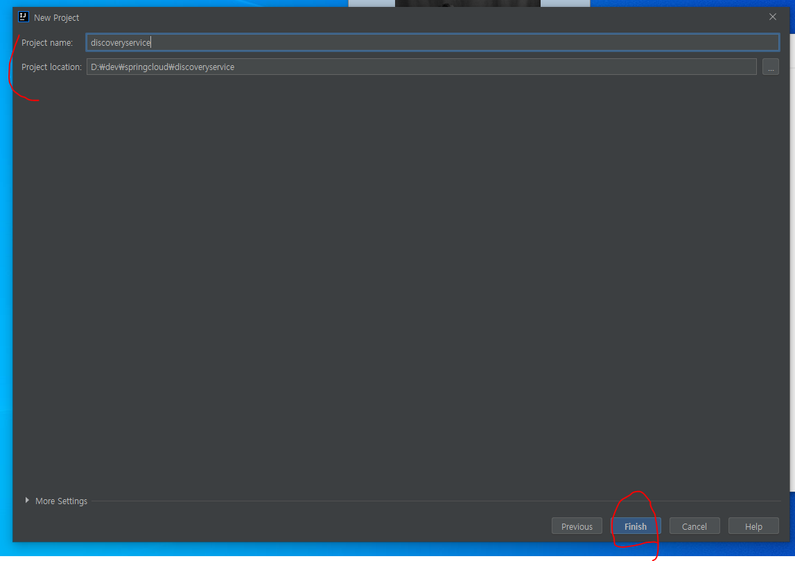 마지막으로 프로젝트 명과 위치를 정해주고 finish를 눌려주자. 그러면 프로젝트가 구동된다.