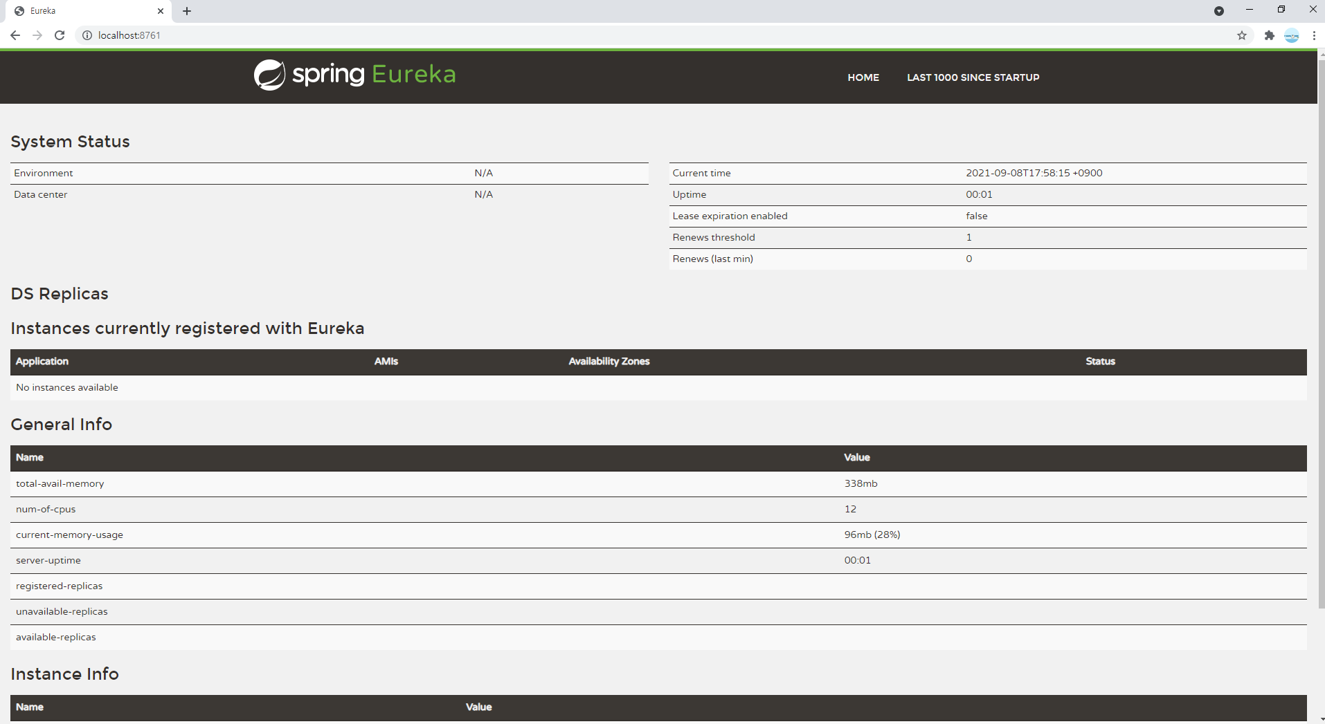 이렇게 Eureka Server가 잘 뜨는걸 확인할 수 가 있다.