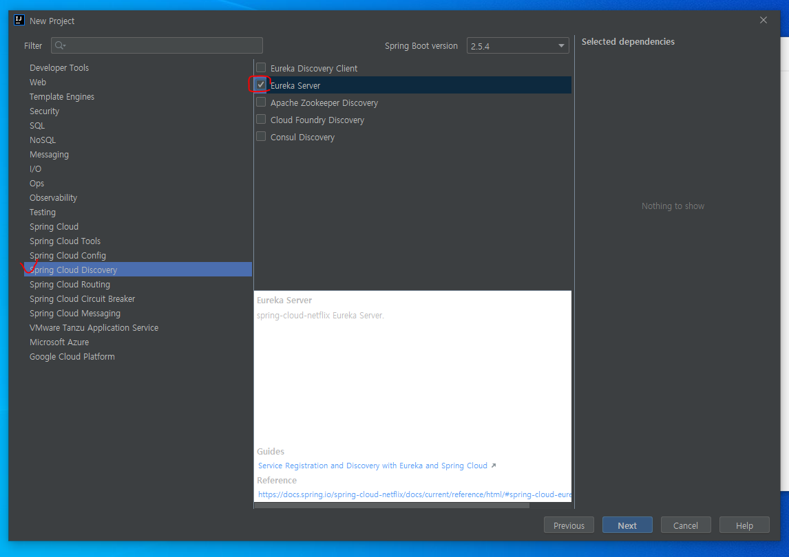 다음은 Eureka Server관련하여 의존성 주입을 해줘야하는데 위에 붉게 체크해놓은 걸 클릭하고 Next를 클릭해주자.