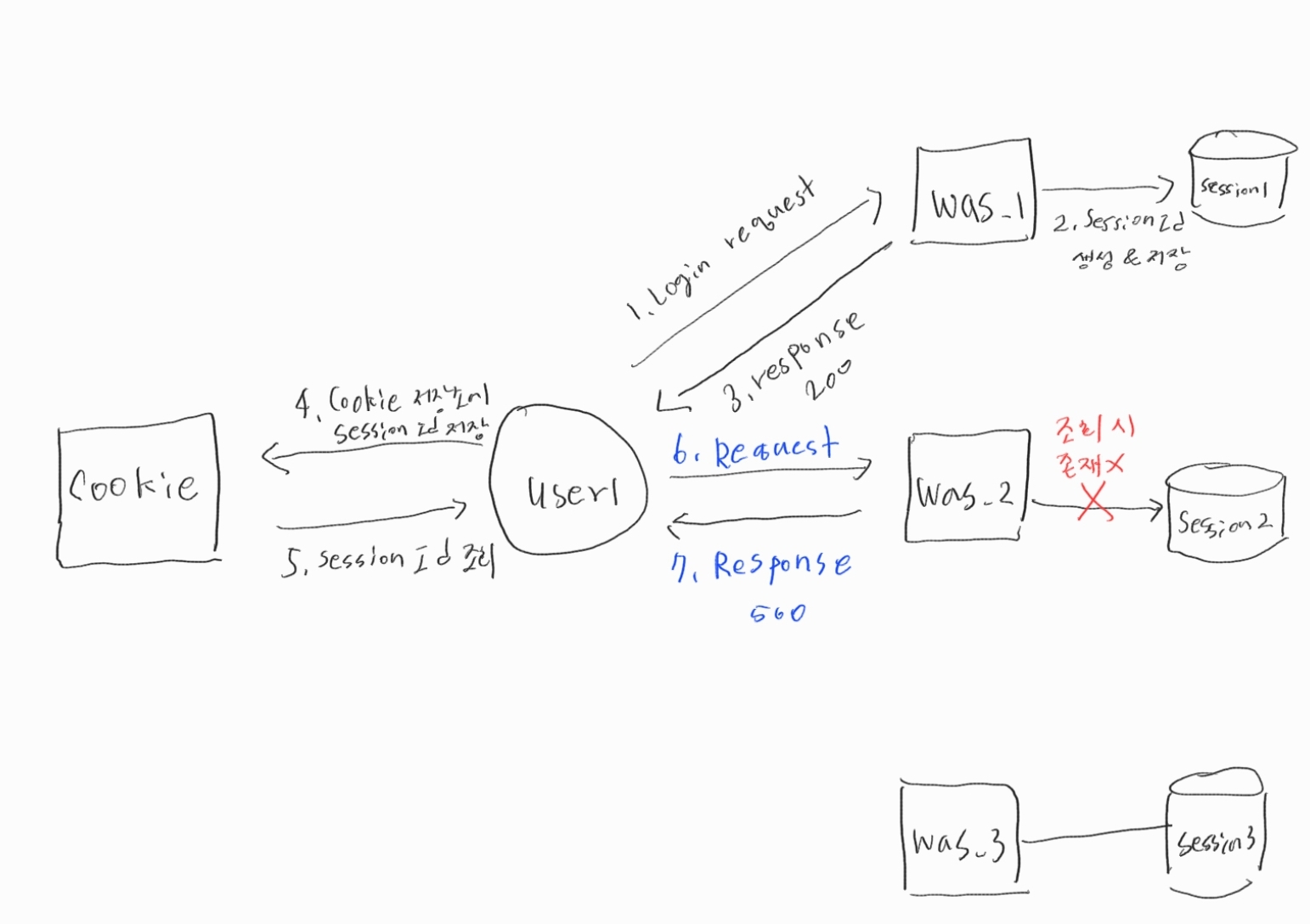 그런데 위의 시스템은 치명적인 문제가 있다. 바로 각서버가 세션 정보를 공유하지 못한다는 것이다. 그러다보니 로그인 서비스를 통해 Session ID 가 Was 1번 서버에 생성이 되고 저장이 되어도, 다른 서비스가 1번 was가 아닌 2번이나 3번 was로 요청이 되면 session ID가 없어 500에러를 발생시킬 것이다.