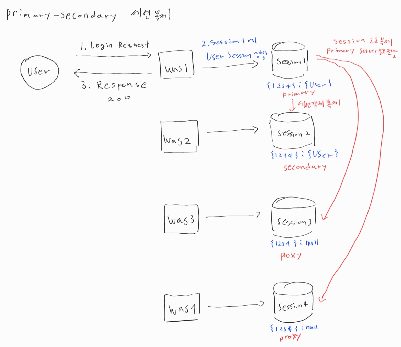 위에 보이는 것처럼 Primary 서버는 백업 서버인 Secondary 서버에 세션 객체를 복사한다. 그리고 그 이외의 서버에는 session id 만 복제되고 객체 자체는 null 로 두어 메모리 사용을 줄인다. 실제로 해당 세션을 사용하려할때에서야 객체값을 복사하게 한다.