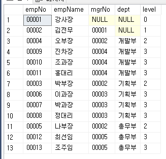 SELECT replicate(' ', level) + empName AS [직원이름], dept [직원부서]