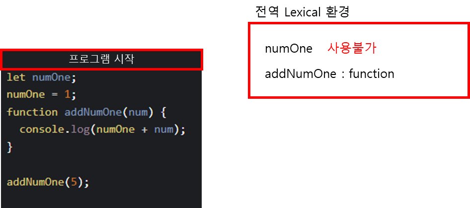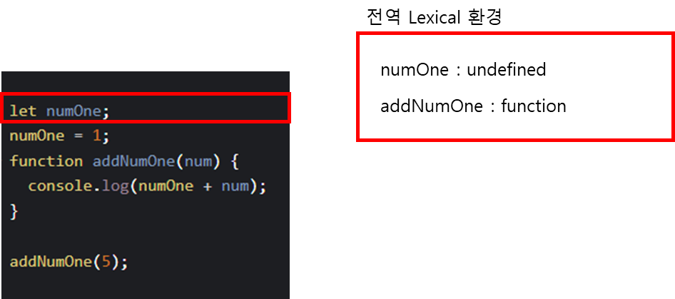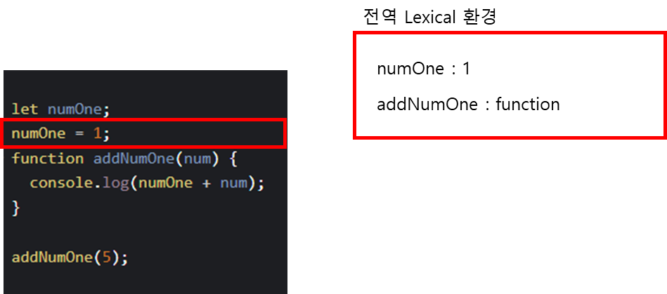 이 프로그램이 실행되면 아래처럼 전역 어휘적 환경 ( Lexical Environment) 에 numOne 변수와 addNumOne 함수가 자리잡게 된다. 여기서 numOne 변수는 초기화가 되지 않아 사용이 불가한 상태일 것이고, addNumOne은 함수선언을 했기에 바로 사용 가능한 상태가 된다.