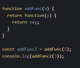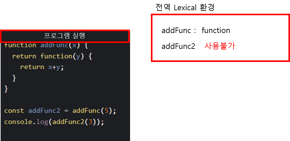 이 환경에는 전달 받은 매개변수 x의 값이 들어가게 된다. 그리고 addFunc2는 리턴하는 함수로 초기화 하게 된다.