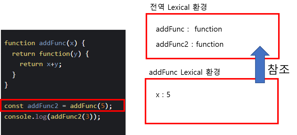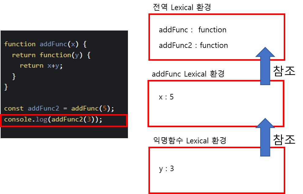 익명함수 렉시컬 환경 -> addFunc 렉시컬환경 -> 전역 렉시컬환경 순으로 참조하여 변수를 찾아갈 것이다.