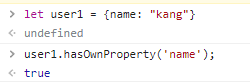 실제로 hasOwnProperty (해당 키가 객체의 프로퍼티인지 아닌지 체크해주는 기능을 수행) 라는 것을 써보면 위처럼 true, false 로 결과가 잘 리턴 되는 것을 볼 수 있다.